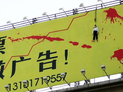 Si tratta di una bizzarra idea pubblicitaria che, ironizzando sulla cirsi economica internazionale, invita (io direi terrorizza) i cinesi a non investire i loro capitali in borsa.